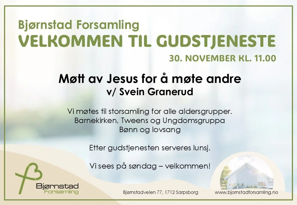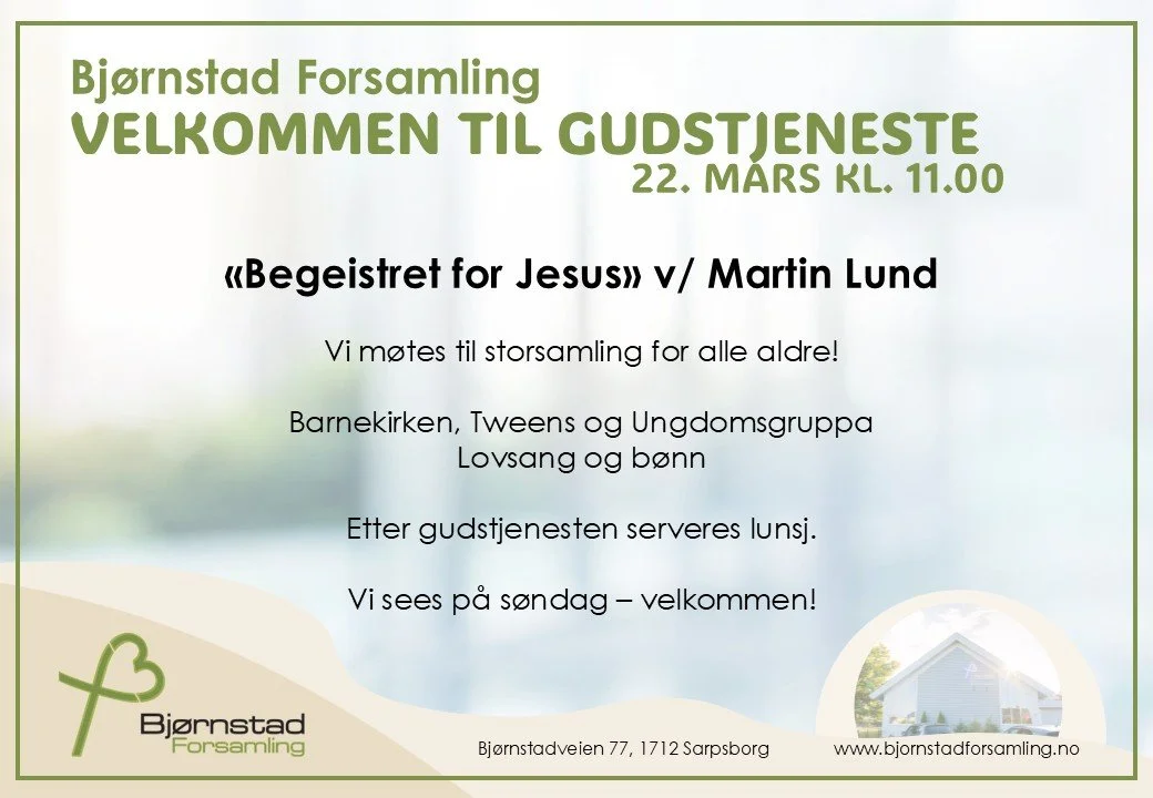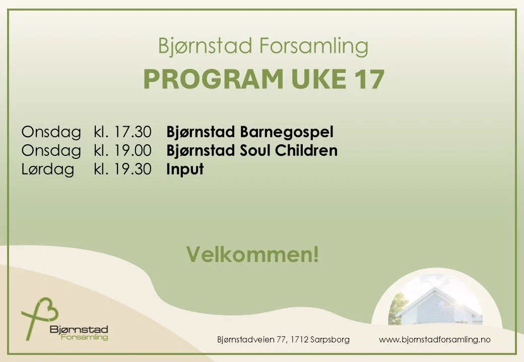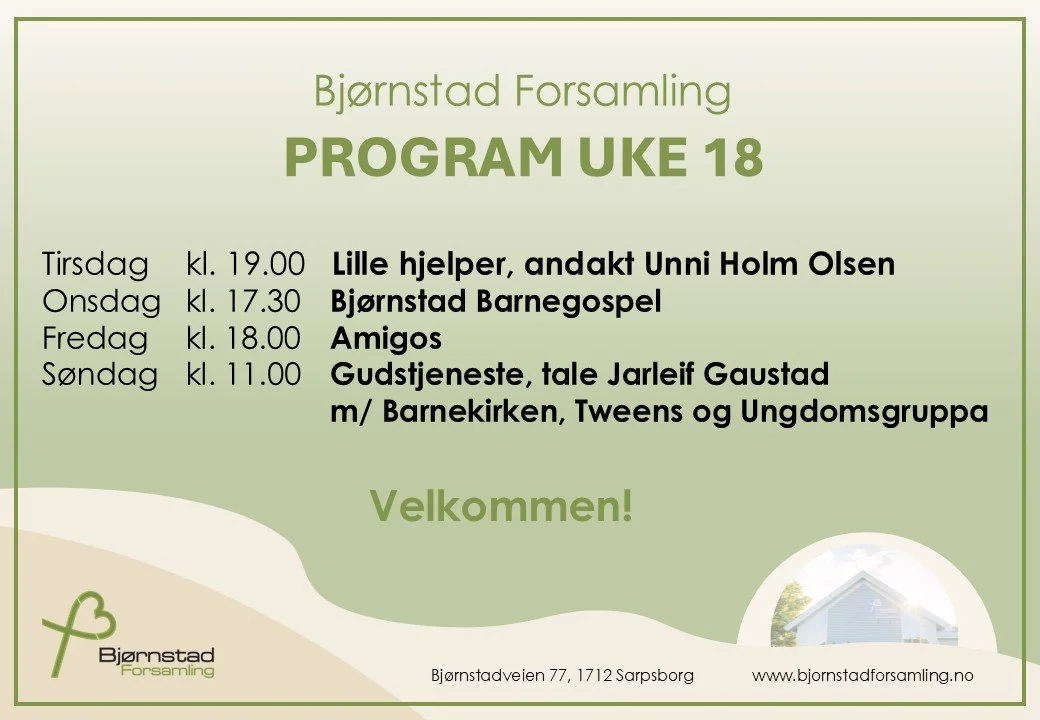 Bjørnstad Forsamling er en levende kristen forsamling i Sarpsborg. Vi har mange tilbud og aktiviteter for alle aldre gjennom hele uken, blant annet Gudstjeneste for hele storfamilien der vi samtidig har Barnekirke og Tweens for den yngre garde. Etter Gudstjenesten er alle velkommen til å bli igjen til enkel servering. Vi spanderer. Dette er en fin anledning til å bli kjent med nye mennesker.