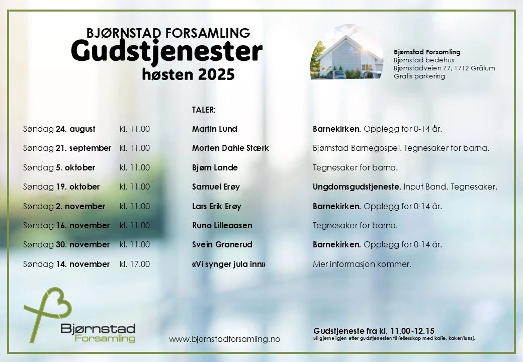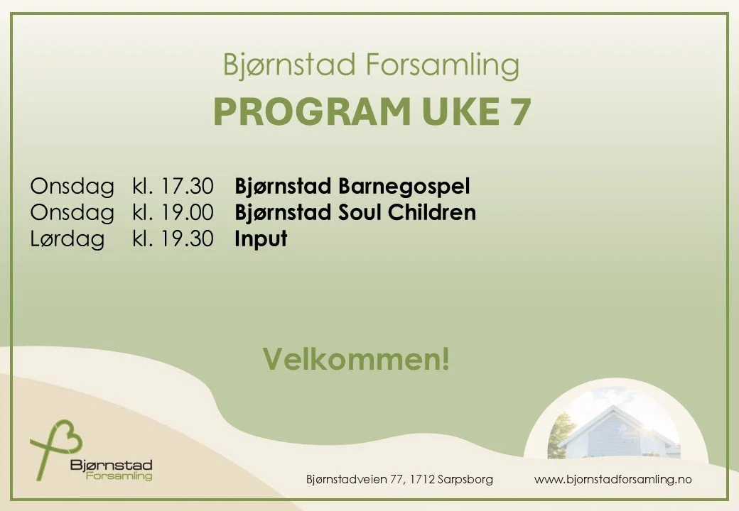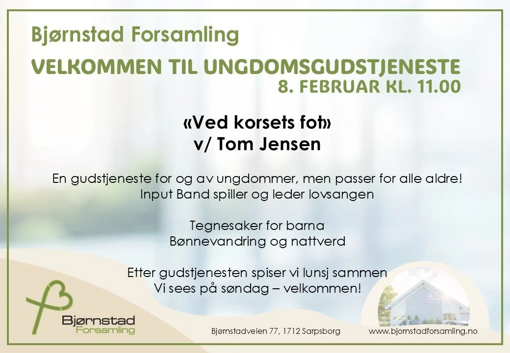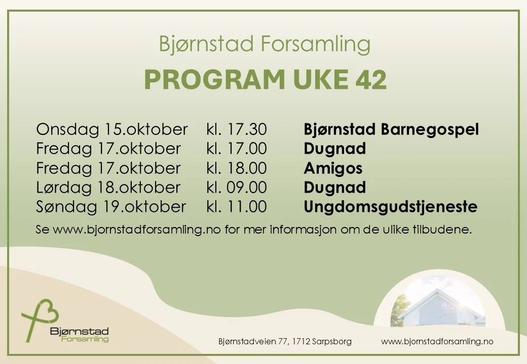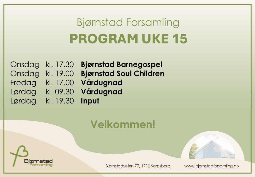Bjørnstad Forsamling er en levende kristen forsamling i Sarpsborg. Vi har mange tilbud og aktiviteter for alle aldre gjennom hele uken, blant annet Gudstjeneste for hele storfamilien der vi samtidig har Barnekirke og Tweens for den yngre garde. Etter Gudstjenesten er alle velkommen til å bli igjen til enkel servering. Vi spanderer. Dette er en fin anledning til å bli kjent med nye mennesker.
