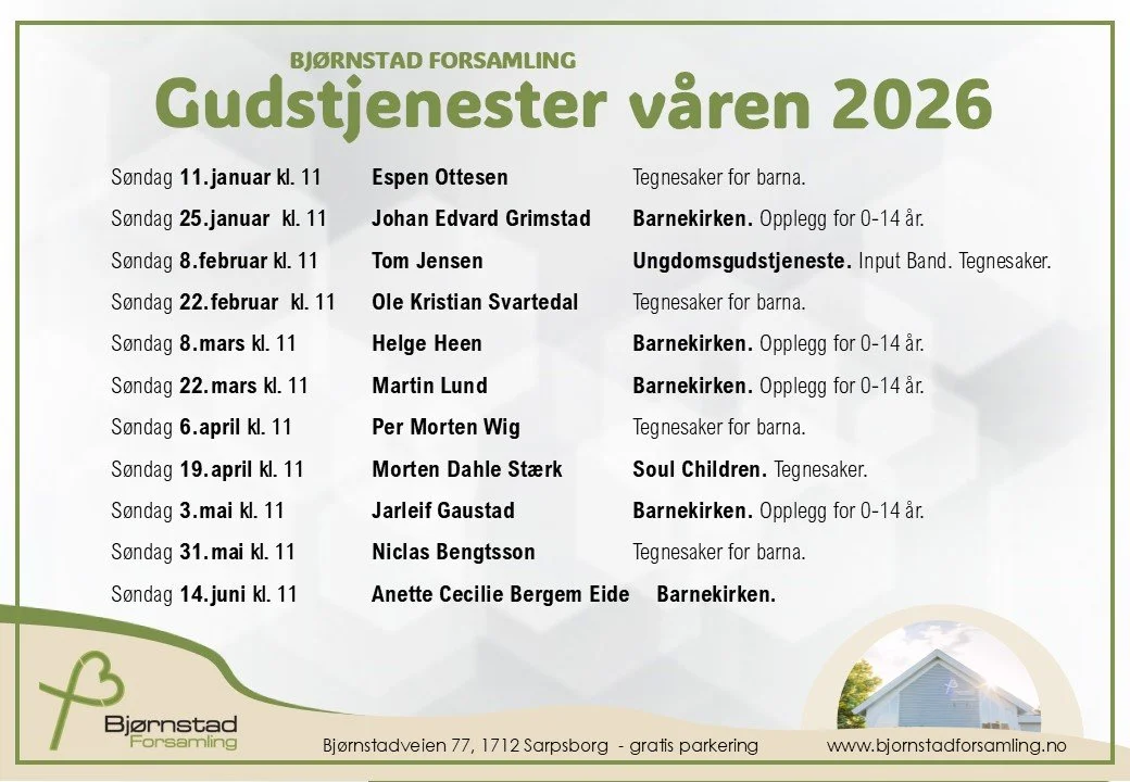 Bjørnstad Forsamling er en levende kristen forsamling i Sarpsborg. Vi har mange tilbud og aktiviteter for alle aldre gjennom hele uken, blant annet Gudstjeneste for hele storfamilien der vi samtidig har Barnekirke og Tweens for den yngre garde. Etter Gudstjenesten er alle velkommen til å bli igjen til enkel servering. Vi spanderer. Dette er en fin anledning til å bli kjent med nye mennesker.
